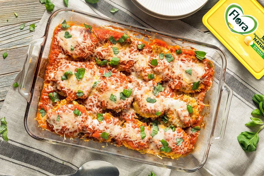 - Preparamos la bechamel fundiendo la margarina Flora Original en una cazuela. Después le añadimos la harina y removemos hasta que se dore. A continuación añadimos la leche caliente sin parar de remover hasta que esté todo integrado y sin grumos. Finalmente salpimentamos y le añadimos un toque de nuez moscada.