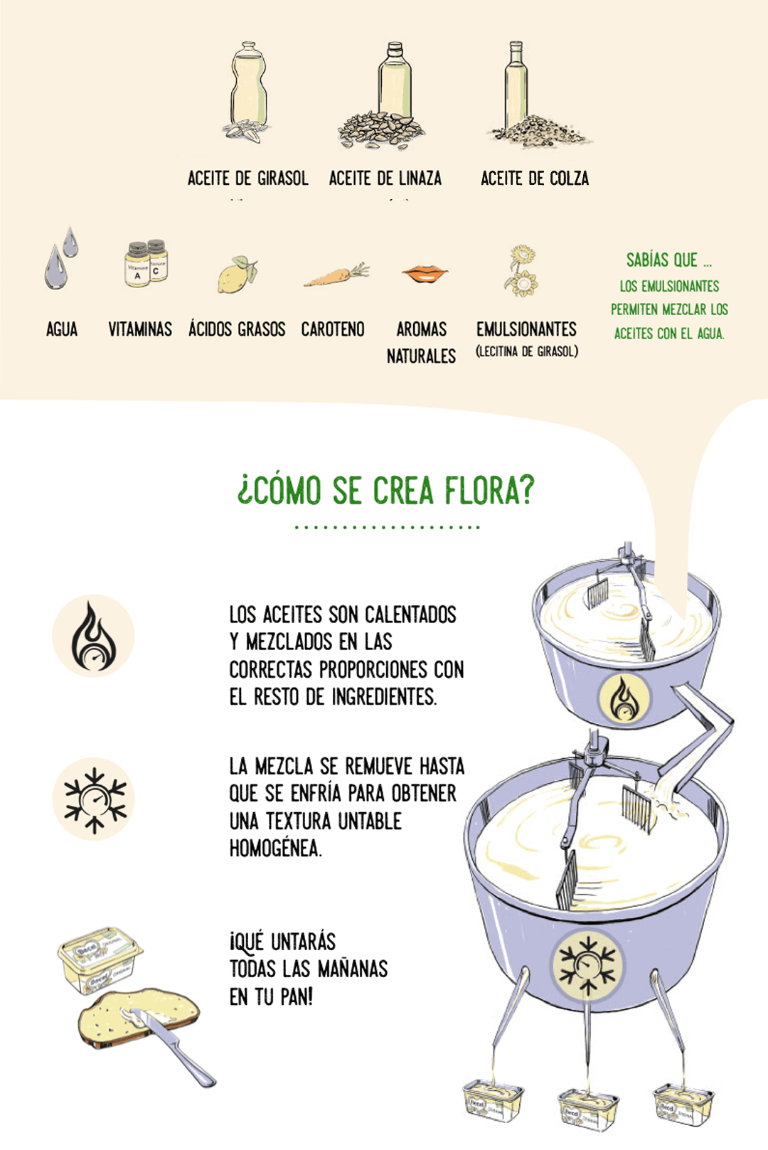 Para asegurar una ingesta saludable de grasas por ración, la receta de Flora Original es rebajada con agua. Como ya sabrás, la grasa y el agua no se mezclan bien, por eso añadimos lecitina de girasol, para conseguir una mezcla uniforme. Esto tiene lugar en la fábrica, en una maquinaria especial, que permite enfriar los aceites lentamente mientras son mezclados.